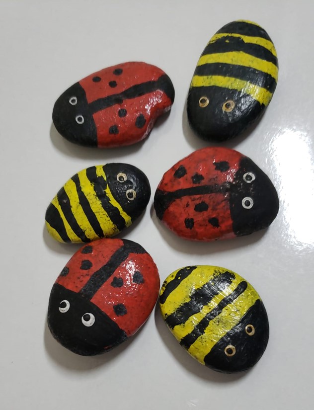 3. Les pintes com tu vulguis. Tingues en compte que seràn fitxes i per tant que tres han de ser d'una manera i les altres tres d'una altra. Pots fer-les, per exemple, com si fossin marietes o abelles.